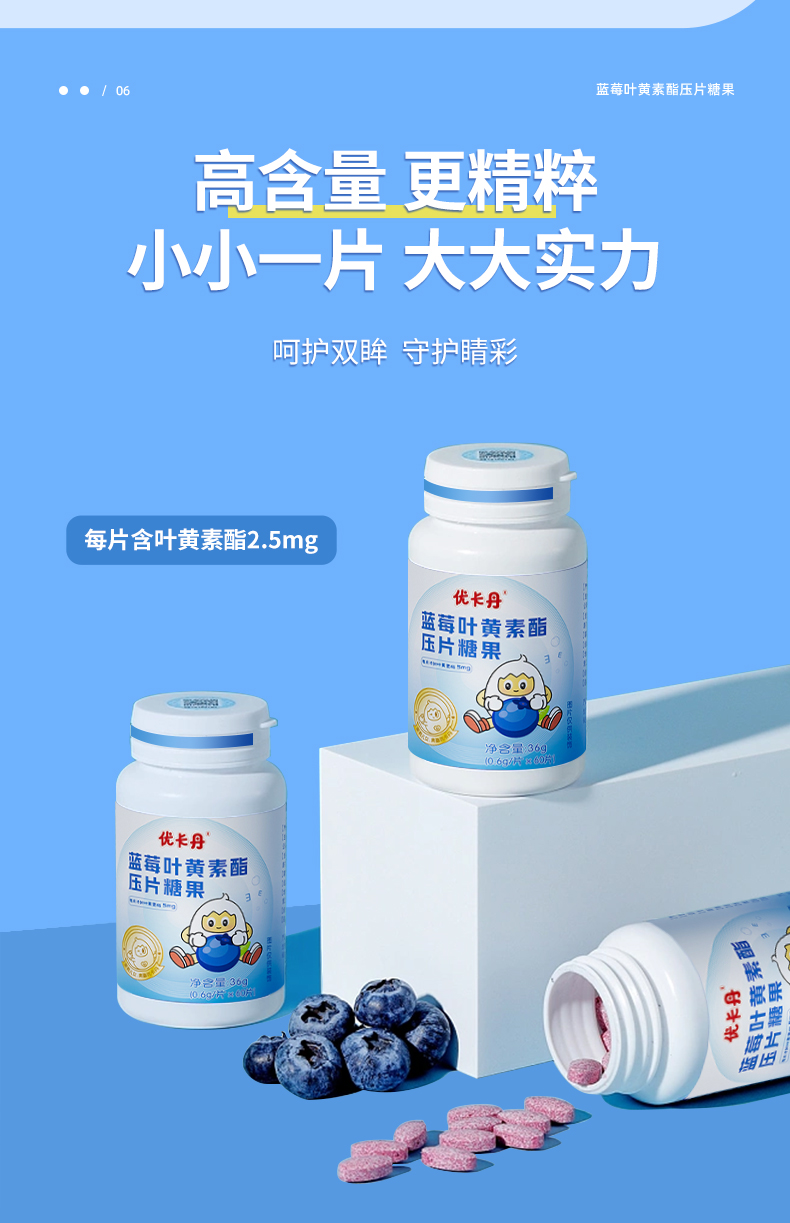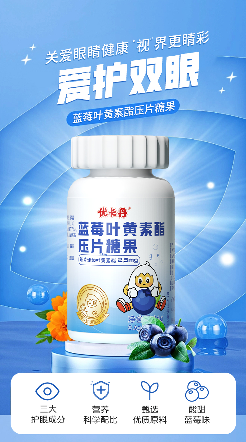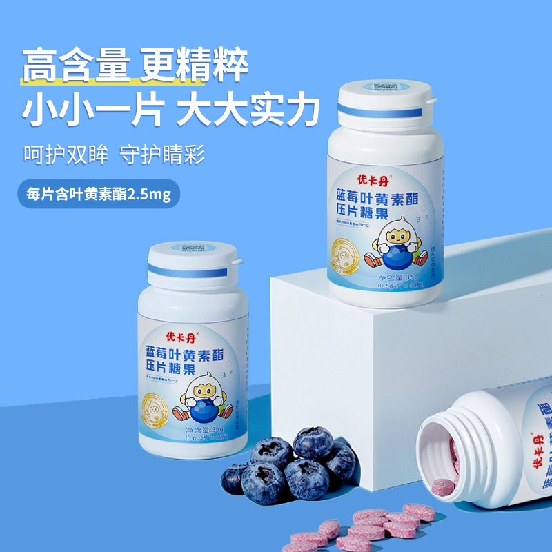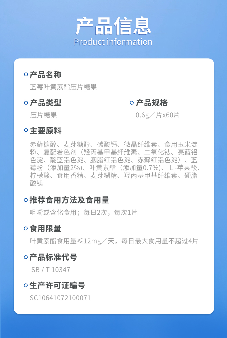 配料表:赤藓糖醇、麦芽糖醇、碳酸钙、微晶纤维素、食用玉米淀粉、复配着色剂(羟丙基甲基纤维素、二氧化钛、亮蓝铝色淀、靛蓝铝色淀、胭脂红铝色淀、赤藓红铝色淀)、蓝莓粉(添加量2%)、叶黄素酯(添加量0.7%)、 L -苹果酸、柠檬酸、食用香精、麦芽糊精、羟丙基甲基纤维素、硬脂酸镁