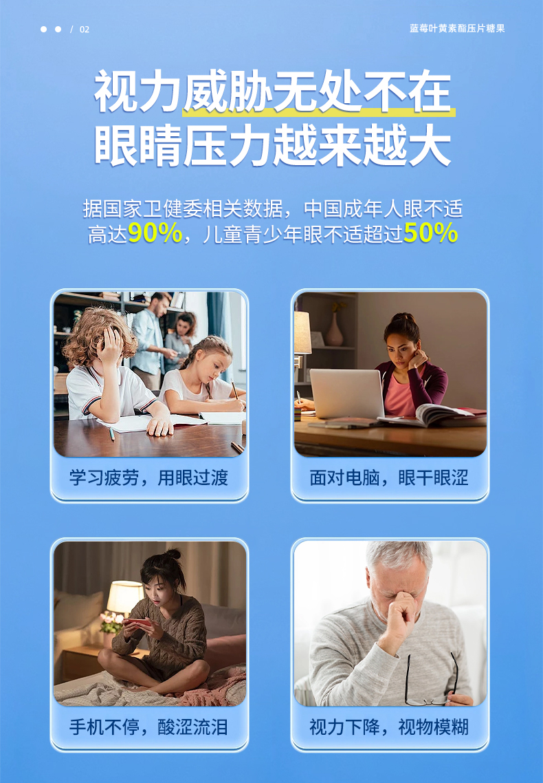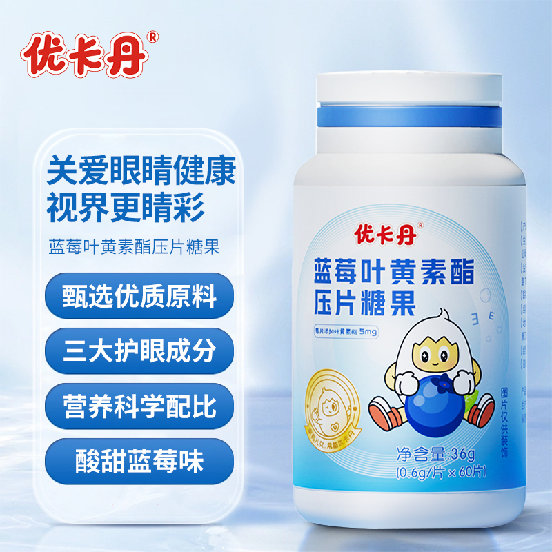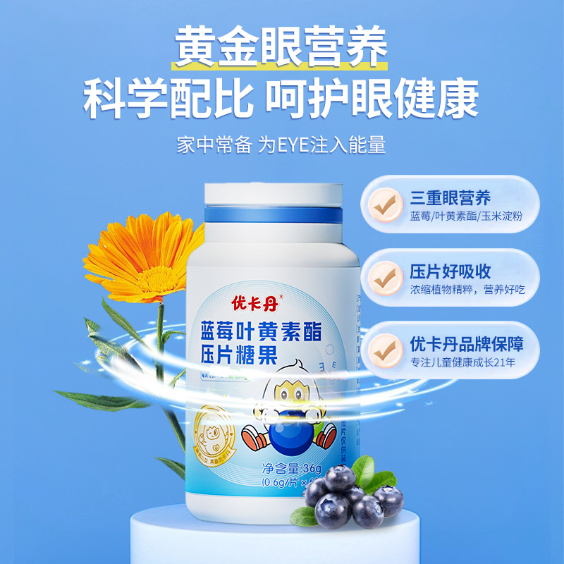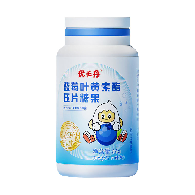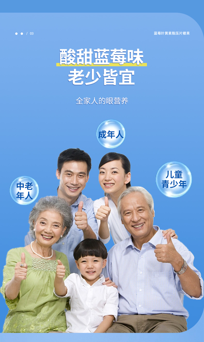 配料表:赤藓糖醇、麦芽糖醇、碳酸钙、微晶纤维素、食用玉米淀粉、复配着色剂(羟丙基甲基纤维素、二氧化钛、亮蓝铝色淀、靛蓝铝色淀、胭脂红铝色淀、赤藓红铝色淀)、蓝莓粉(添加量2%)、叶黄素酯(添加量0.7%)、 L -苹果酸、柠檬酸、食用香精、麦芽糊精、羟丙基甲基纤维素、硬脂酸镁