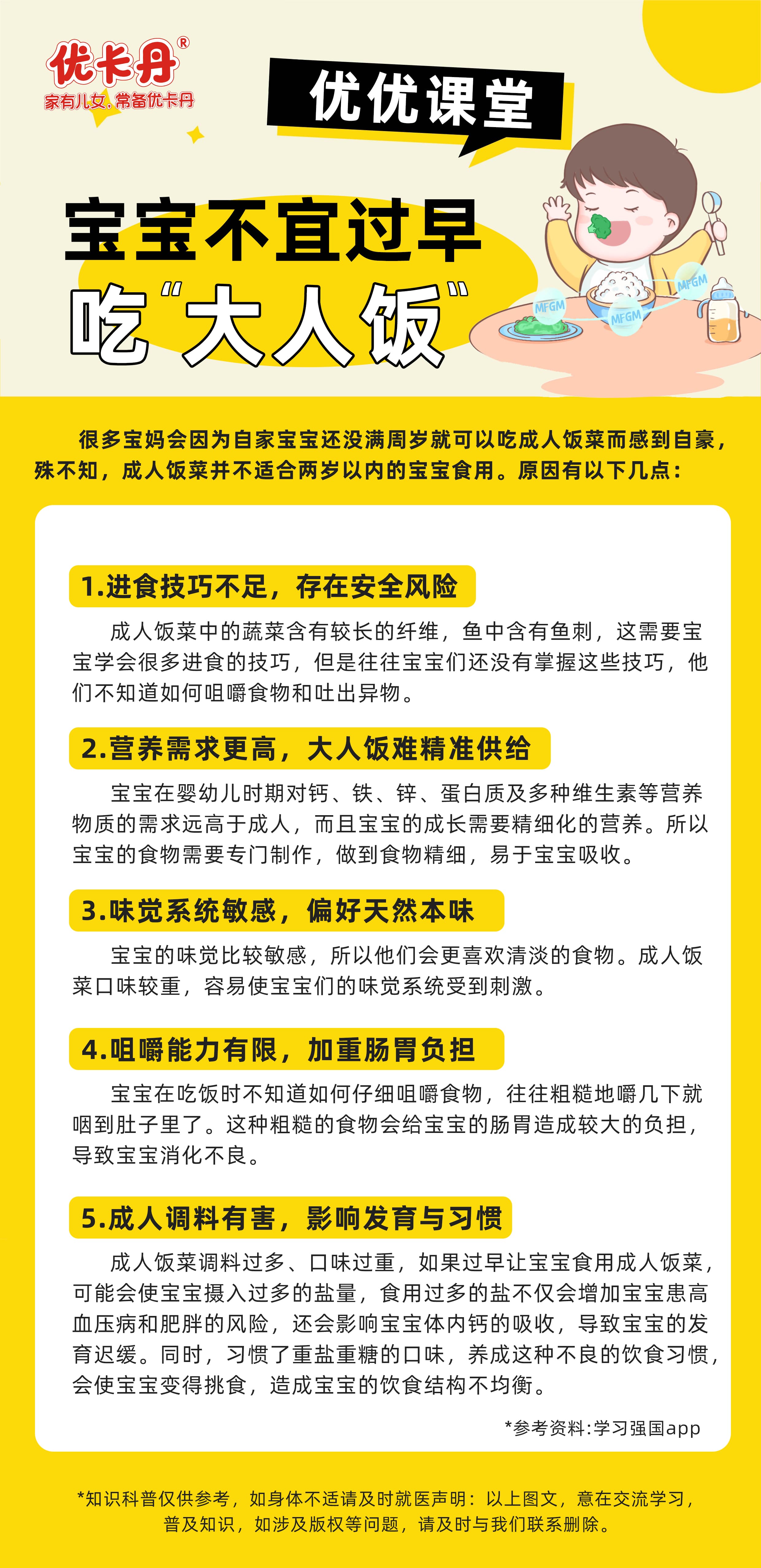 本期「优优科普课堂」就为家长们重点解析:孩子过早吃“大人饭”的隐藏危害。别再等到孩子出现挑食、便秘或消化不适才后悔——科学喂养,其实可以很轻松。