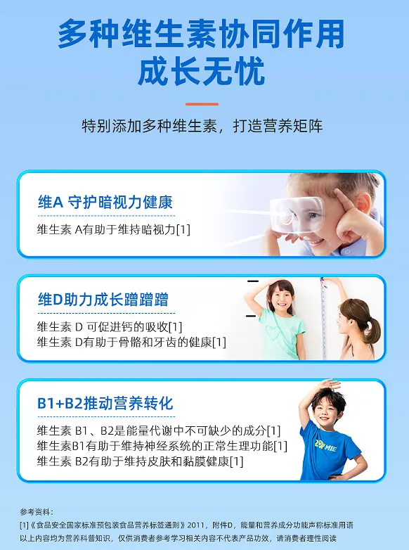 除了核心的骨胶原肽与高钙,还特别添加了铁、锌、维生素A、B族维生素及足量维生素D等,形成一个全面的营养矩阵。它们各司其职,相互促进,不仅支持骨骼发育,更有助于整体免疫力的提升,实现1+1>2的成长支持效果。