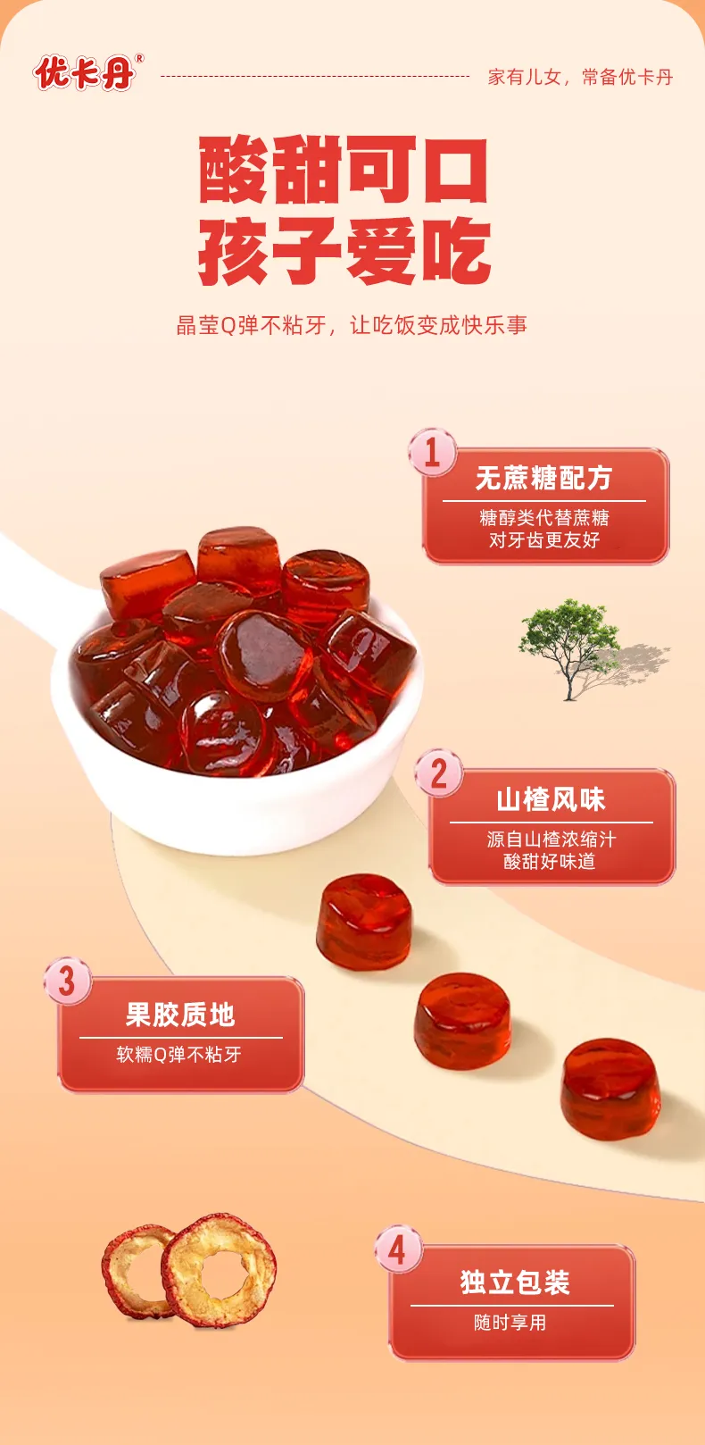 再好的营养,孩子不吃也白费。优卡丹将这款产品做成Q弹酸甜的软糖,孩子当成零食主动要吃。0人工香精、色素,妈妈更安心。