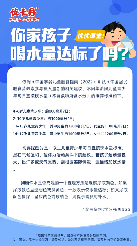 科学育儿,从了解开始。快来看看您家孩子的饮水量有没有达标吧!家有儿女,常备优卡丹,让我们共同守护孩子每一天的安心与健康。