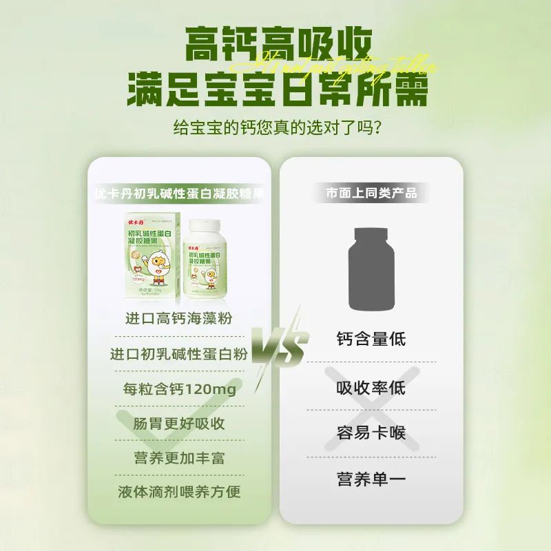 对比之后,明智之选!优卡丹初乳碱性蛋白凝胶糖果,以其独特的进口高钙海藻粉作为钙源,每粒富含120mg钙质,不仅含量高,更重要的是,它以液体形态存在,肠胃吸收更顺畅,解决了传统钙片易卡喉、吸收不佳的难题。
