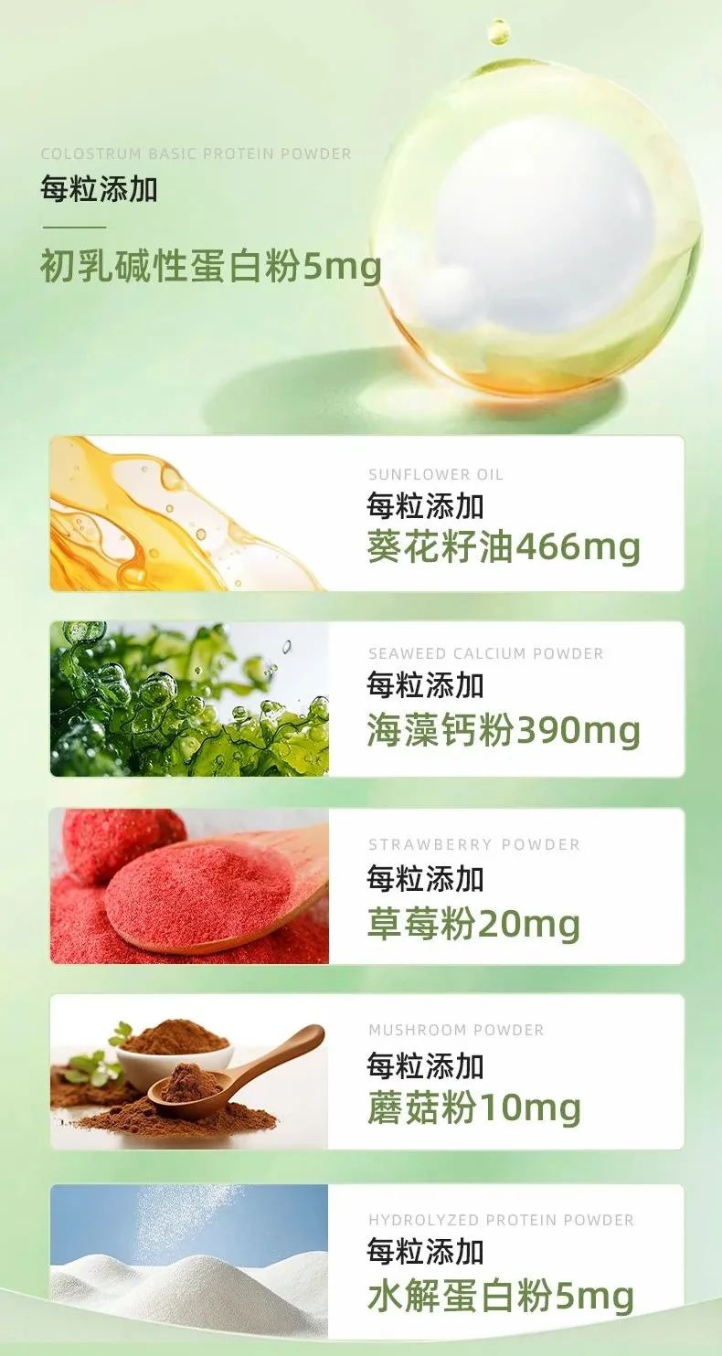 在优卡丹的世界里,没有“单一成分”的妥协,只有科学配比,均衡营养的坚持。每粒优卡丹初乳碱性蛋白凝胶糖果中,除了高钙,还精心配比了5mg进口初乳碱性蛋白粉、466mg葵花籽油、390mg海藻钙粉、20mg草莓粉……
