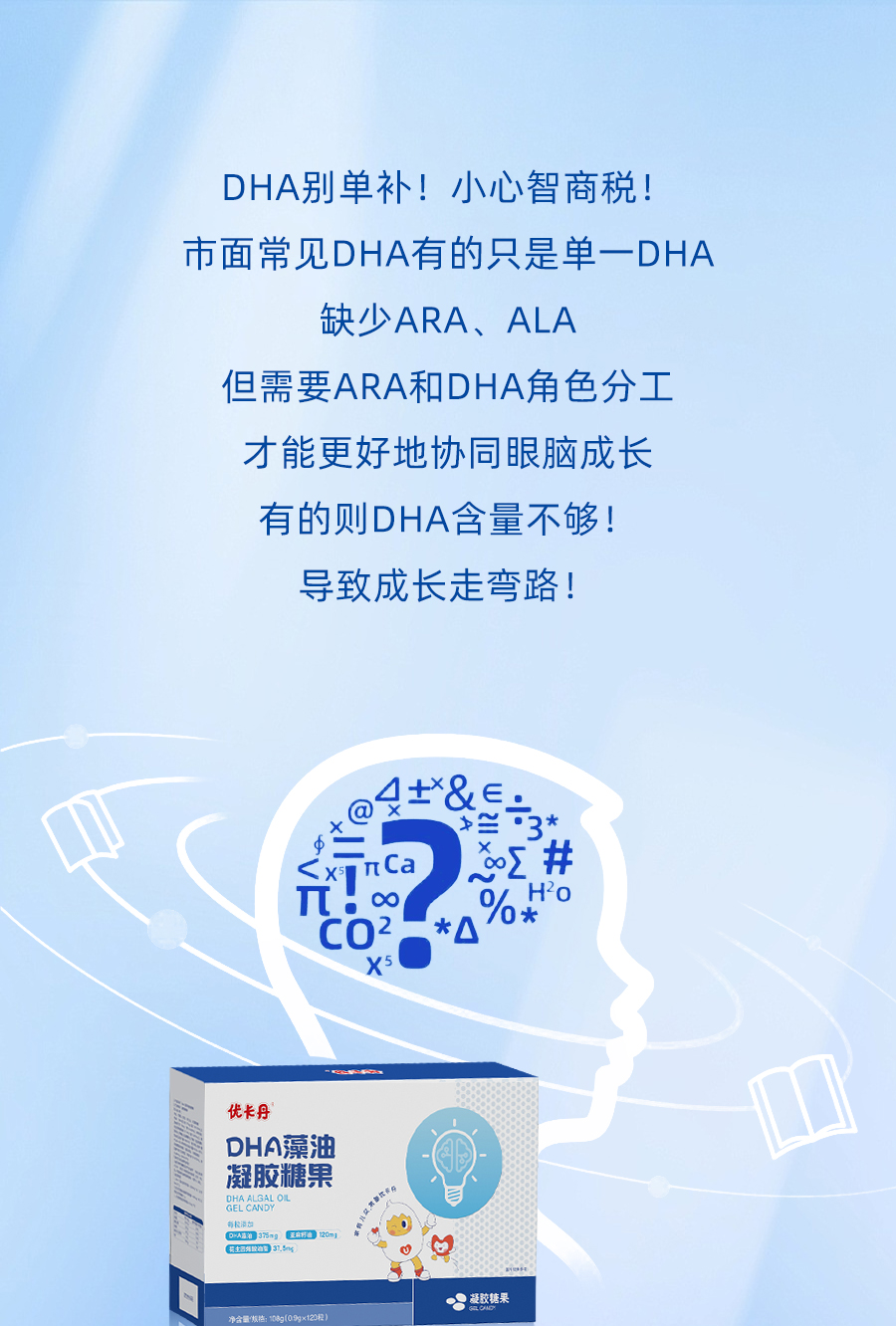 内料:DHA藻油375mg/粒 、亚麻籽油120mg/粒 、核桃油、花生四烯酸油脂37.5mg/粒 、紫苏籽油、柠檬油、乳酸菌后生元粉(麦芽糊精、植物乳植杆菌RH03147、植物乳植杆菌HCS03-001、罗伊氏粘液乳杆菌HCS02-001)、叶黄素酯油悬液(葵花籽油、叶黄素酯)